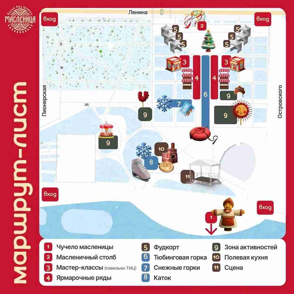 Гостей праздника ждет насыщенная культурная программа. На площади Ленина с 13:00 будут работать три игровые зоны: детская, семейная и силовая. Организаторы подготовили 12 интерактивов: