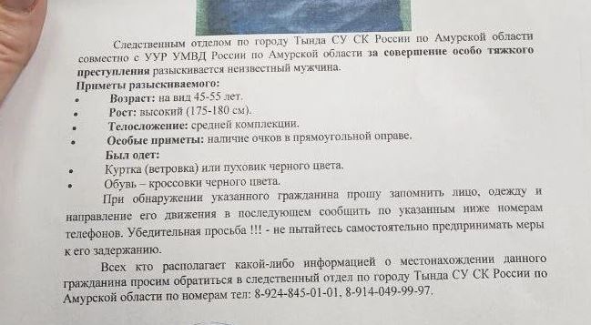 Исходя из распространяемой в соцсетях ориентировки – подозреваемый высокий мужчина 45-50 лет, носит очки в прямоугольной оправе. Поисками амурчанина занимаются полицейские и следователи города Тында.