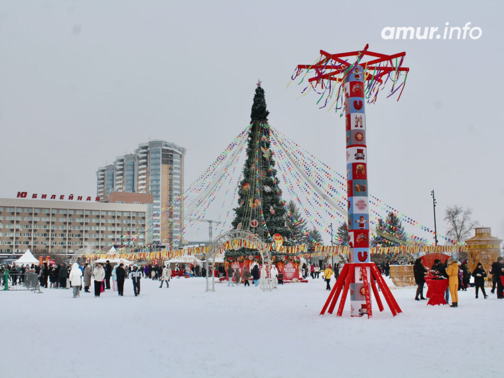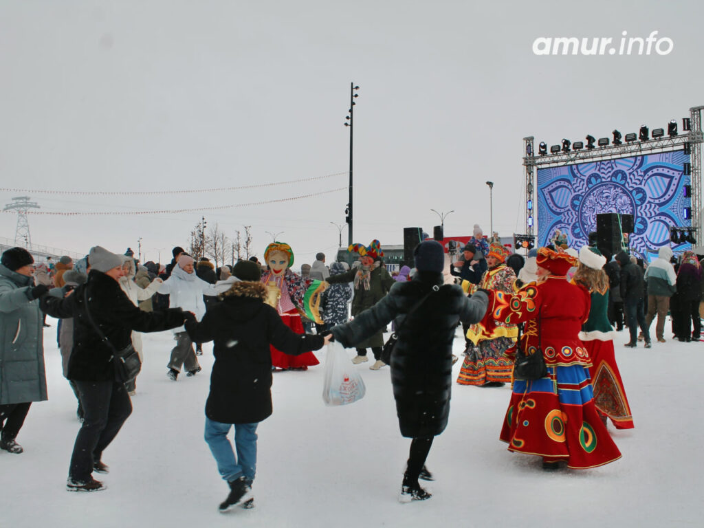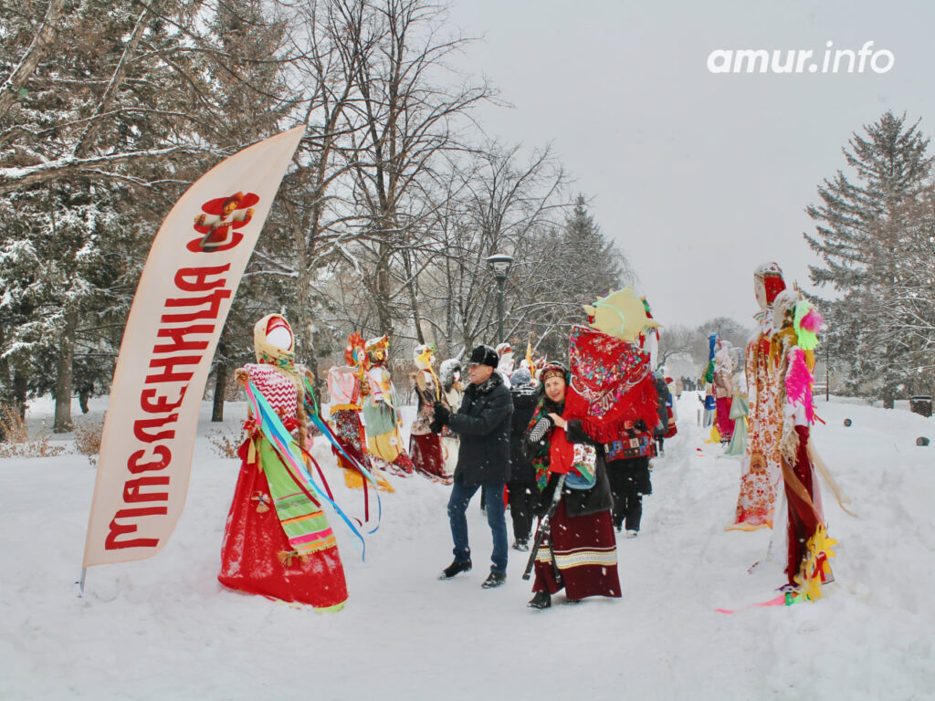 Начались народные гуляния с «Солнечного шествия». В агентстве гостеприимства Амурской области рассказали, что в нём приняли участие 47 трудовых и творческих коллективов города, всего около тысячи человек. Конечно, было всё – костюмы, частушки, плакаты и сделанные своими руками чучела Масленицы. Преодолев путь от Триумфальной арки до площади Ленина, не забыли и про хоровод.