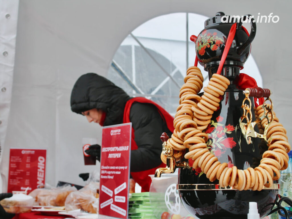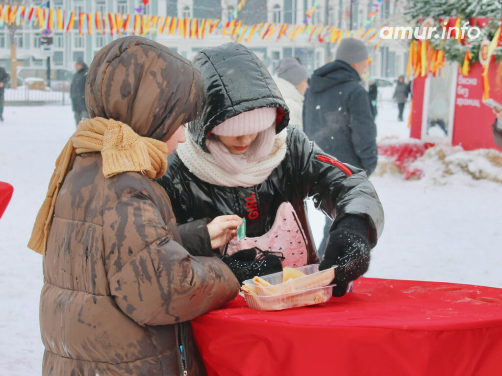 Наконец, нужно было где-то перекусить. И это организаторы предусмотрели, а иначе как? Масленица и без блинов? А ещё пирожки, слойки, горячий чай… Приятно уставшие от народных забав благовещенцы уплетали всё с большим удовольствием.