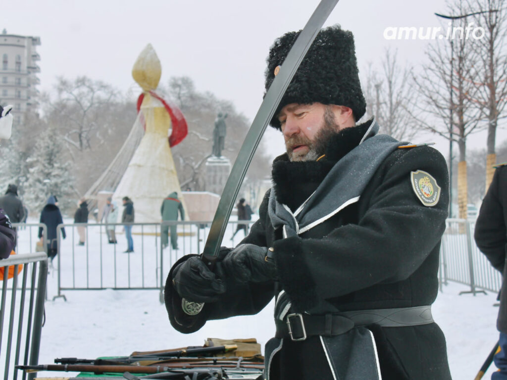 Прямо возле новогодней ёлки благовещенцы могли послушать интересности из уст настоящих казаков. И даже испытать шашку и нагайку!