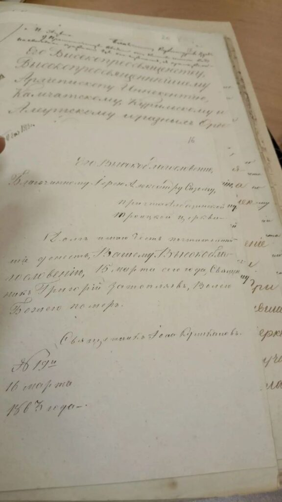 — Для определения имени священника, останки которого обнаружили в Албазинском остроге, проводилась работа в архивах, а также с опубликованными источниками. Какие-то материалы, способные пролить свет на судьбу этого человека, уже публиковались в литературе по истории Амурской области, истории Албазинского прихода, истории церкви в Приамурье. И вот по ним, в частности по переписке святителя Иннокентия, архиепископа Камчатского, Курильского и Алеутского, искали сведения о судьбе погребённого в остроге священника. В письме к генерал-губернатору Восточной Сибири Николаю Николаевичу Муравьёву-Амурскому он объяснял, что отправил в Албазинскую станицу на служение священника Григория Затопляева.