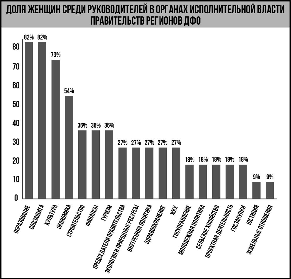 Обращая внимание на процентное соотношение женщин в правительствах, эксперты отметили два региона Дальнего Востока: Хабаровский край и Магаданскую область. В первом женщины выделяются словно маяки среди суровых скал: их всего четыре среди двадцати четырех мужчин, два зампреда, два министра. Во втором, напротив, больше половины министерств в области возглавляют женщины (а именно восемь из двенадцати). Также там три зампреда правительства из восьми.