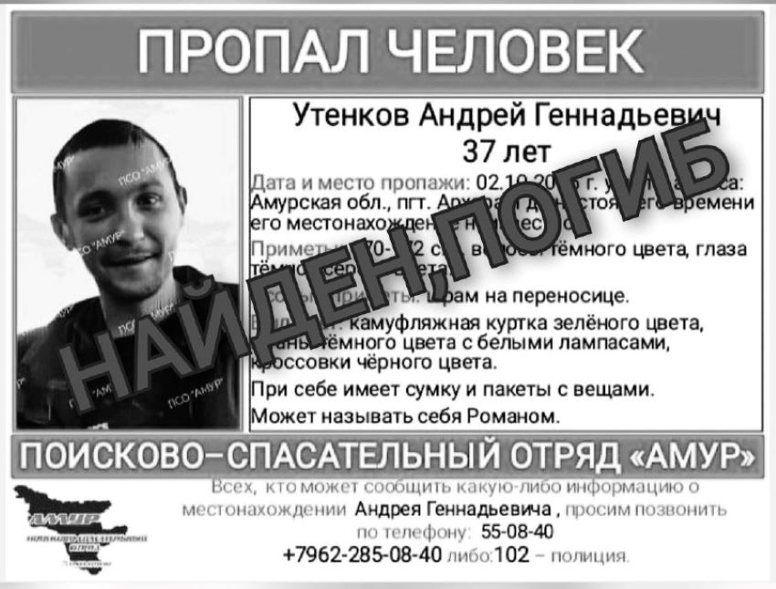 Эта информация действительно помогла в поисках, однако завершились они печально: оказалось, мужчина погиб. Как объяснили корреспонденту Амур.инфо в поисково-спасательном отряде «Амур», на самом деле тело Андрея обнаружили быстро, в том же месяце, когда он пропал, в Архаре.