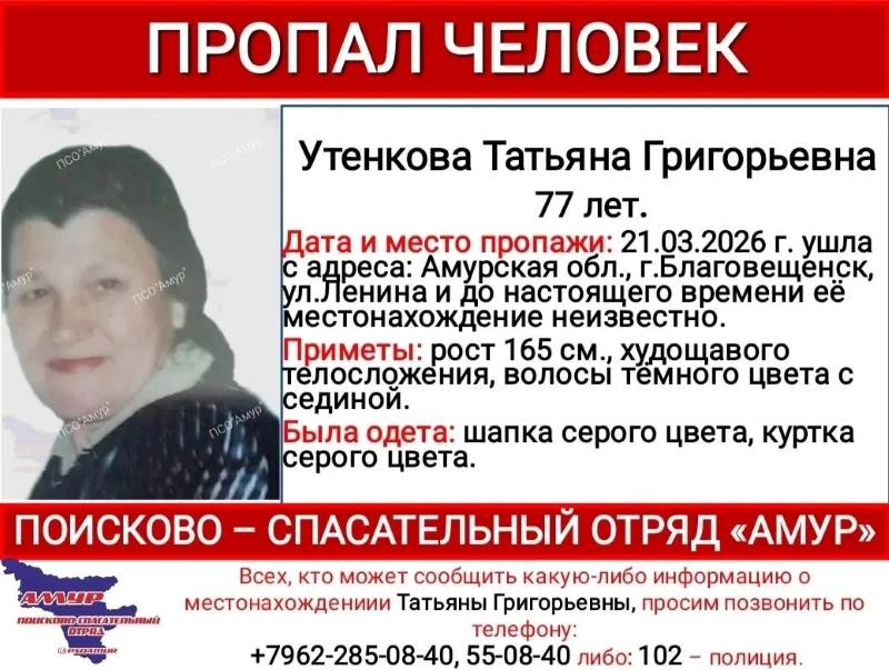 77-летняя Татьяна Григорьевна Утенкова ушла из дома в Благовещенске 21 марта и до сих пор неизвестно, где она находится. Помочь найти женщину просят представители поисково-спасательного отряда «Амур».