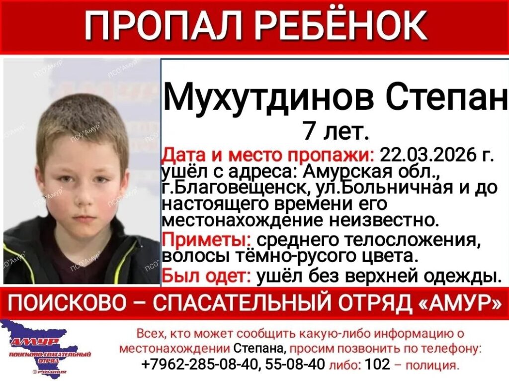 22 марта 7-летний Степан Мухутдинов ушел из дома на улице Больничной в Благовещенске. У школьника темно-русые волосы и среднее телосложение. Известно, что мальчик находится на улице без куртки.