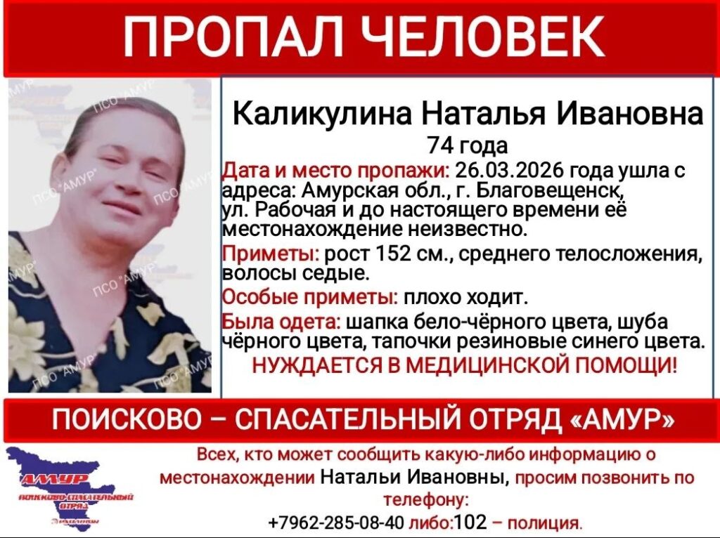 «Все, кто может сообщить какую-либо информацию о местонахождении Натальи Ивановны, просим позвонить по телефонам: +7-962-285-08-40 либо 102 – полиция», – обратились к амурчанам в поисковом отряде.