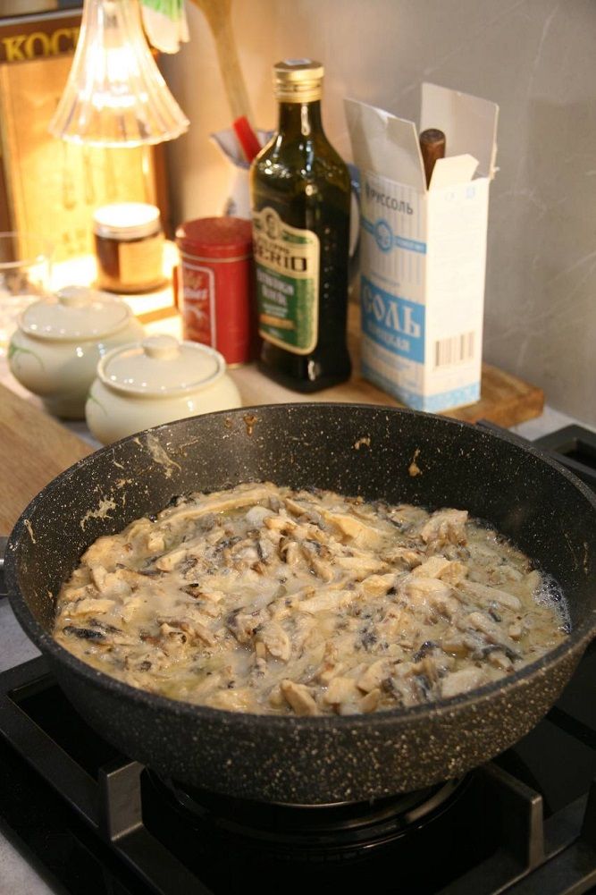 Продолжайте нагревать, постоянно помешивая, пока соус не загустеет. Не снимая сковороды с плиты, выложите в загустевший соус обжаренные грибы, курицу и лук.