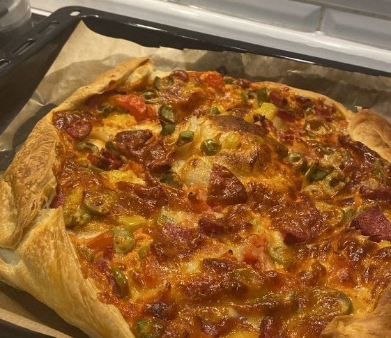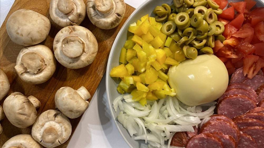 На основу нужно нанести и распределить томатный соус. Лук, болгарский перец и томаты нарезать кубиками, оливки и шампиньоны нашинковать слайсами. Колбасу порезать кружочками. Начинку равномерно выложить на основу.