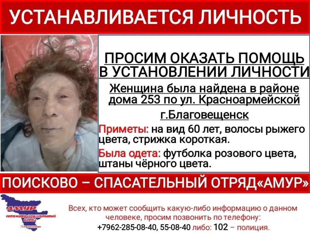 Волонтёры из поисково-спасательного отряда «Амур» попросили благовещенцев опознать женщину. Её тело обнаружили в районе дома № 253 на улице Красноармейской.
