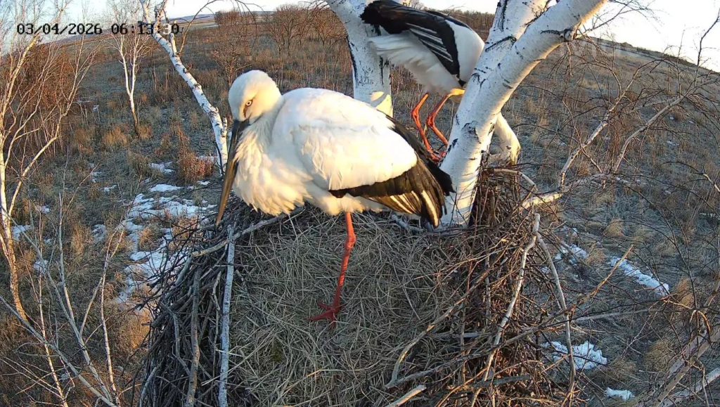 «В день установки камеры аистов на гнезде не было, яйца в гнезде тоже отсутствовали, хотя было видно, что гнездо уже обустраивалось – лежали свежие ветки и сухая солома. Хозяева появились только на следующее утро и продолжили ремонт и обустройство жилища. Скоро уже должно появиться первое яйцо», – сообщает Антон Сасин.