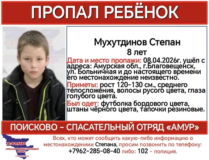 Сегодня, 8 апреля, в Благовещенске пропал восьмилетний Степан Мухутдинов. Мальчик ушёл из дома на улице Больничной, и до сих пор его местонахождение неизвестно. Об этом сообщили в поисково-спасательном отряде «Амур».