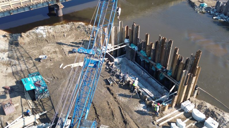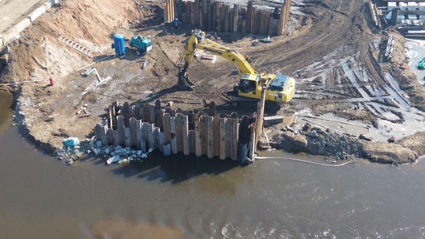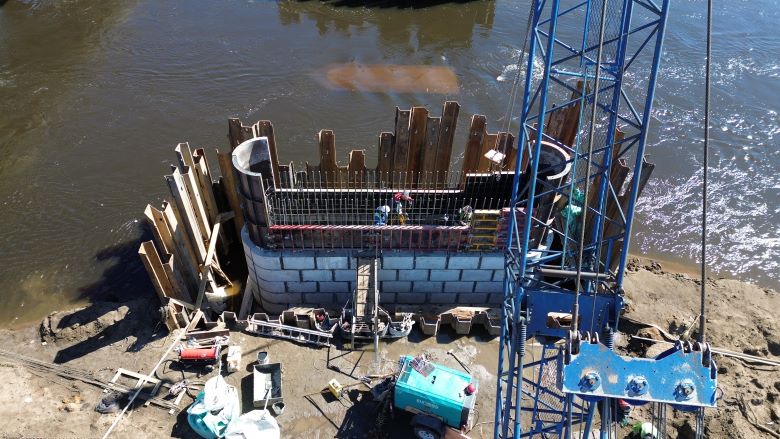 Ныне рабочие уже завершили демонтаж старого моста и обустроили временную объездную дорогу. Теперь работы ведутся в русле реки. Близится паводок, поэтому там особенно важно верное водоотведение. Чтобы быстро осушать котлованы, используют технологию устройства тампонажных слоёв по опорам № 2, 3 и 4. А при бетонировании подводных конструкций применили метод вертикально перемещающейся трубы (ВПТ): с ним можно укладывать высококачественную бетонную смесь прямо под водой, минуя её контакт с потоками.