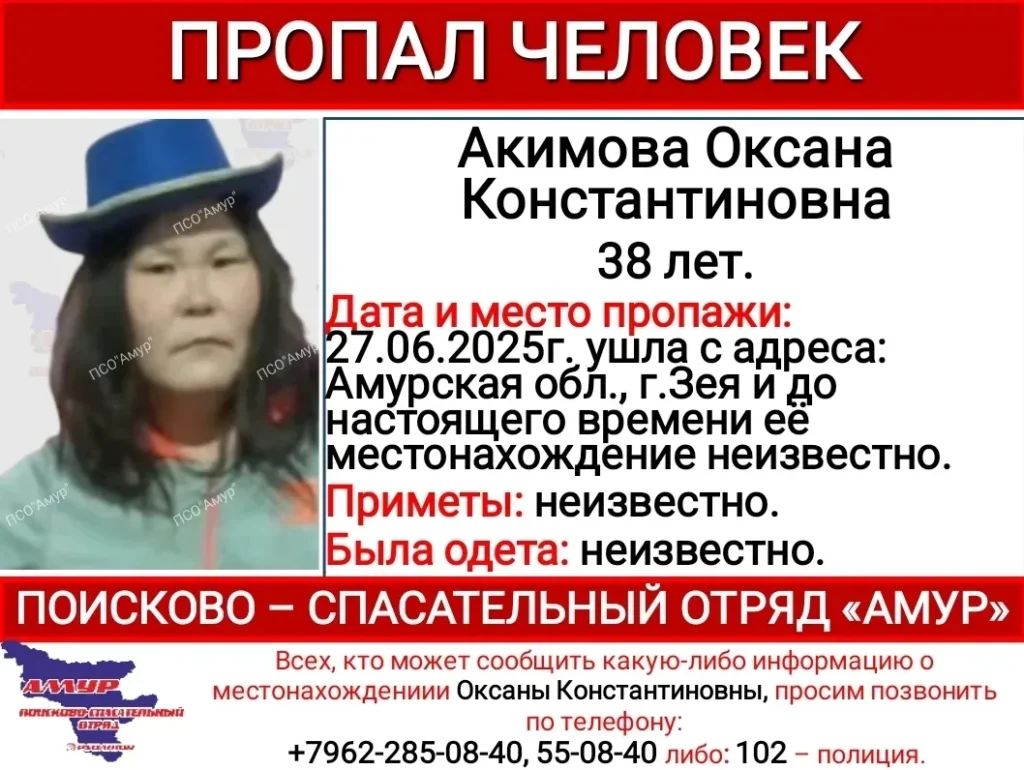 Любую информацию об Оксане можно сообщить в полицию по номеру 102 или в ПСО «Амур» по телефону: 8-962-285-08-40.