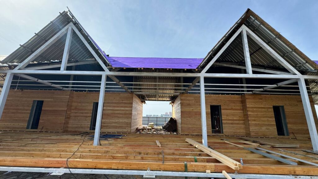 Сейчас на площадке уже возвели каркасы зданий, идёт отделка и проведение коммуникаций. Часть домиков, выходящих на Амур, покрасят в зелёный цвет. В них разместят торговые павильоны с видом на набережную Хэйхэ.