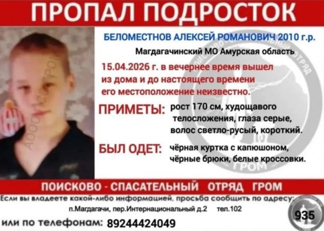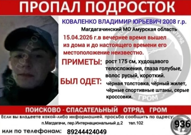 В Приамурье ищут двоих парней из посёлка Магдагачи. Алексей Романович Беломестнов 2010 года рождения и Владимир Юрьевич Коваленко 2008 года рождения пропали 15 апреля. Об этом сообщили в поисково-спасательном отряде «Гром».