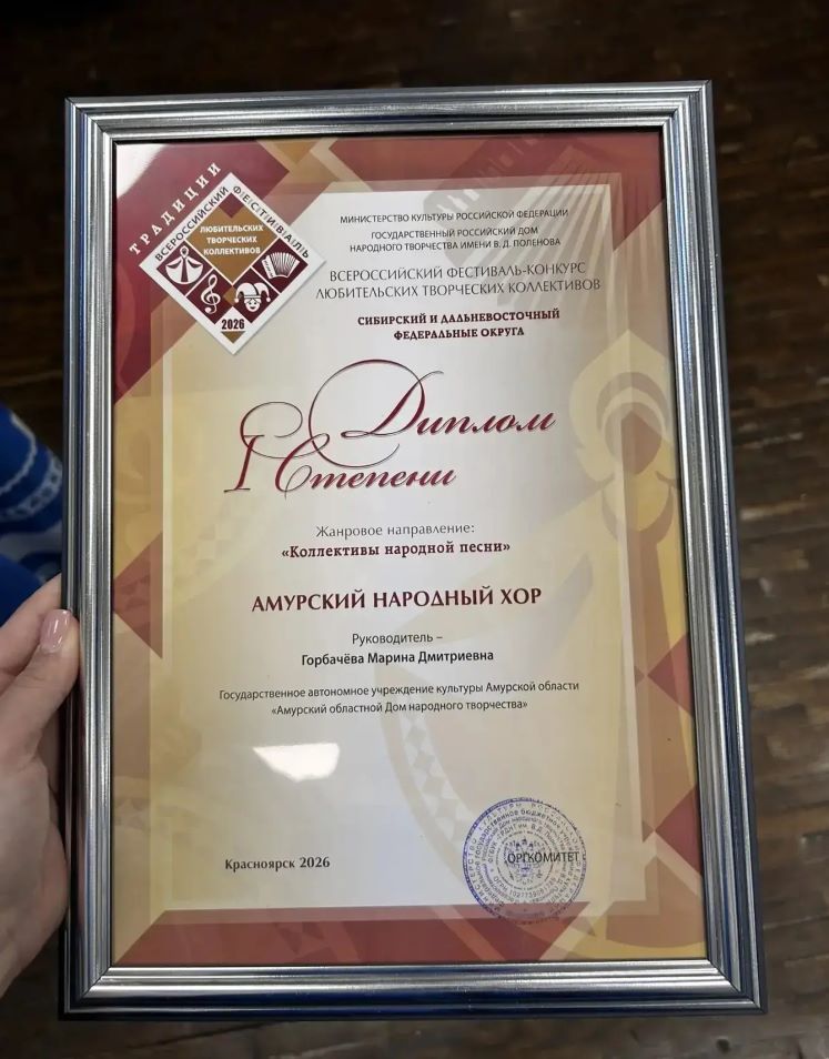Зональный этап Всероссийского фестиваля-конкурса любительских творческих коллективов прошёл 17 и 18 апреля этого года в Красноярске. Там собрались 15 коллективов-финалистов из регионов Сибирского и Дальневосточного федеральных округов. Амурский народный хор был там единственным участником от Приамурья, и не просто достойно выступил – заслужил звание лауреата I степени. Амурские коллеги поздравили творческий коллектив и его руководителя – Марину Горбачёву – с таким впечатляющим результатом.
