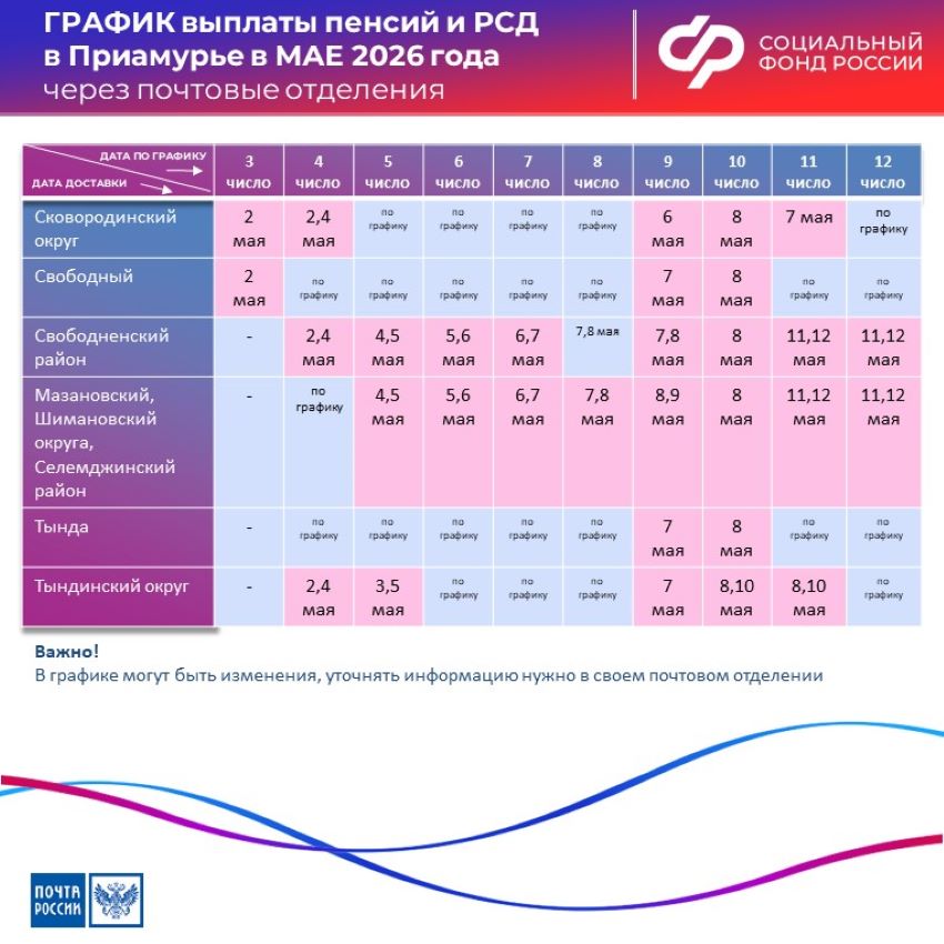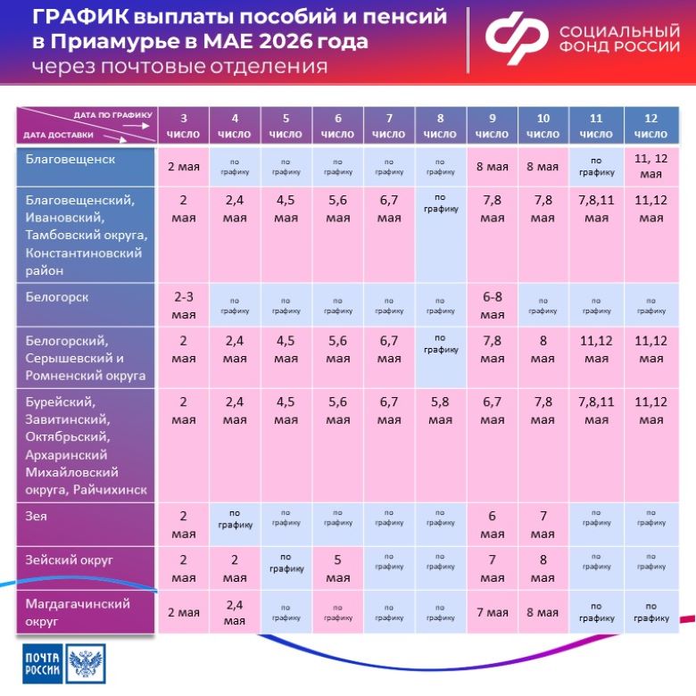 Кроме того, 2 мая жителям Амурской области выплатят пенсии и пособия, которые обычно получают 3 и 4 числа. 4 мая будут доставлять отчисления, которые обычно выдаются 4 и 5 числа. 5 мая доставят выплаты за 5 и 6 число, 6 мая – за 6 и 7 число, 7 мая – за 7 и 8 число, 8 мая доставят средства за 8, 9 и 10 число. 9 и 10 мая – выходные дни, а 11 мая проведут доставку выплат за 11 и 12 число. С 12 мая доставка пенсий и пособий через отделения почтовой связи вновь пойдёт по стандартному графику, все средства, как и положено, выдадут до 20 мая.