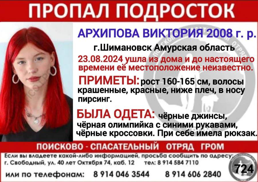 Поисково-спасительный отряд "Гром" разместил ориентировку о поиске Виктории Архиповой. Девушка 2008 года рождения ушла из дома в Шимановске 23 августа. Поисковики уточнили, что у девушки невысокий рост – 160-165 сантиметров....