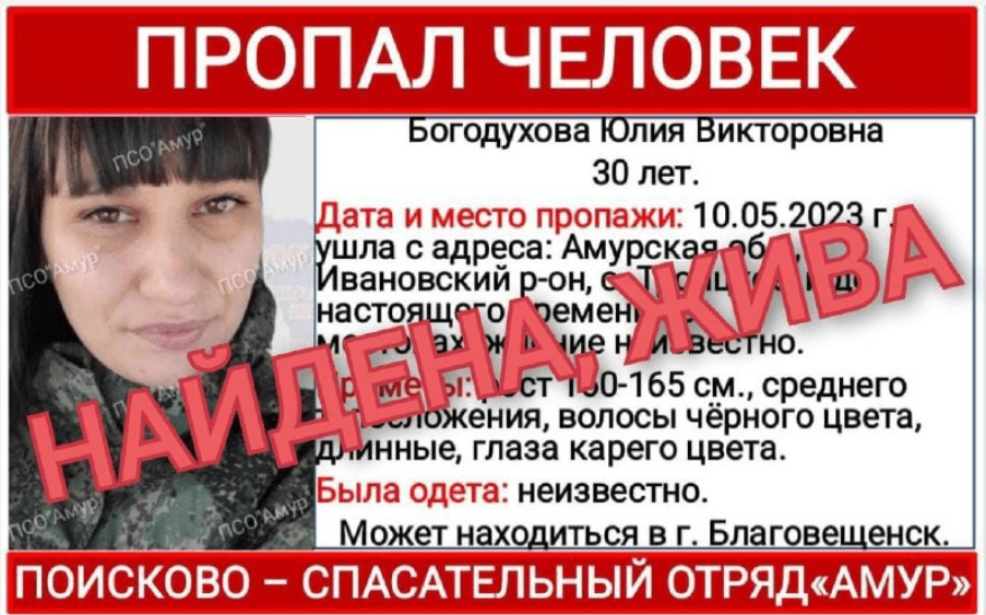 В прошлое воскресенье, 14 мая, Амур.инфо писало о том, что в Приамурье ищут пропавшую без вести жительницу села Троицкого. Хорошей новостью поделились в ПСО «Амур» – девушка нашлась. Напомним, Богодухова...