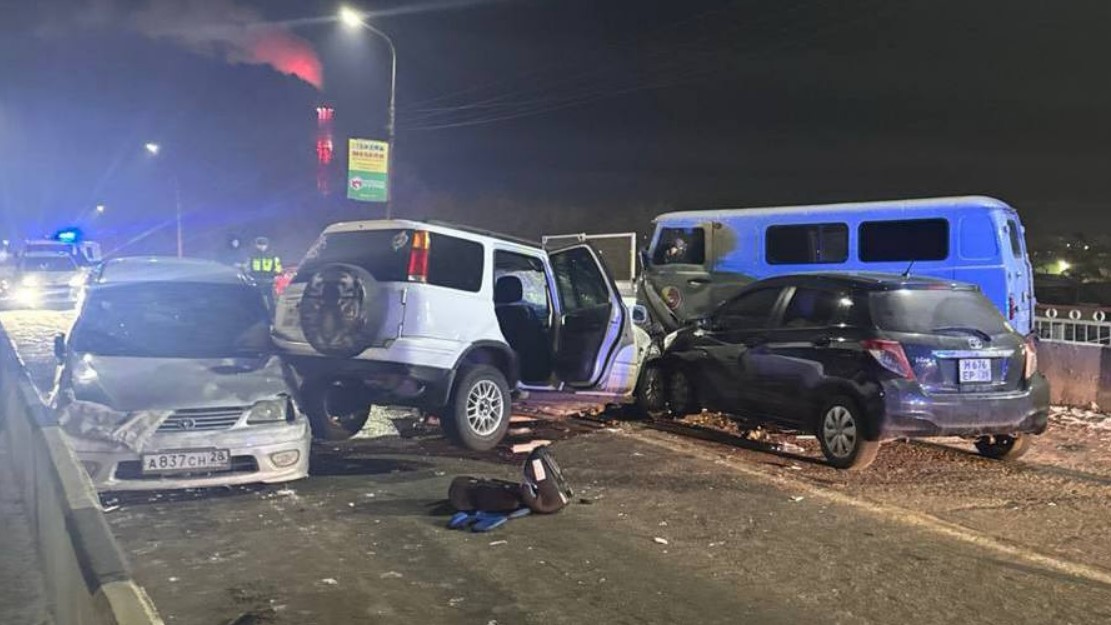 В Белогорске столкнулось сразу четыре автомобиля, пострадало восемь человек, сообщает Амурский центр ГЗ и ПБ. ДТП произошло вечером 9 марта на путепроводе на улице Авиационной, уточнил мэр Белогорска Станислав Мелюков....