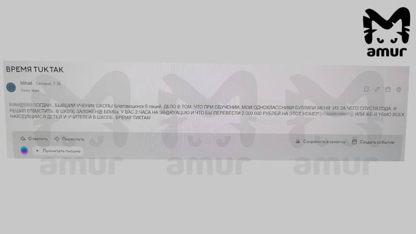 Сообщение о заложенной бомбе пришло в благовещенский лицей № 6. Минёр представился бывшим учеником, сообщил телеграм-канал Amur Mash. Издание отмечает, что на электронную почту учреждения поступило письмо от якобы учащегося...