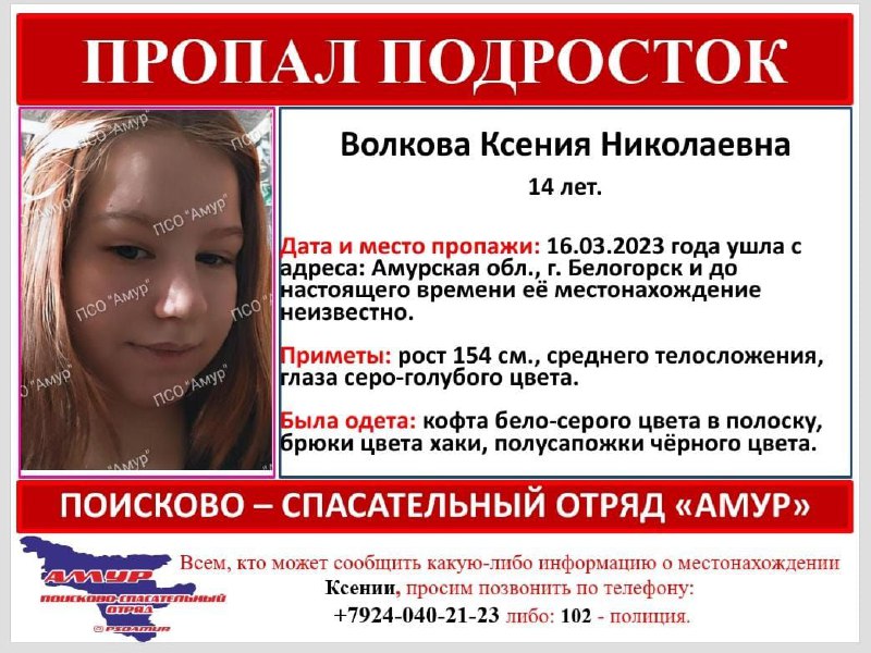 В Белогорске 16 марта из дома ушла 14-летняя Ксения Волкова, её местоположение до сих пор неизвестно. Об этом сообщают в поисково-спасательном отряде «Амур». Девочка среднего телосложения, рост – 154 сантиметра,...