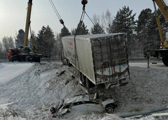 Стало известно о серьезном ДТП на федеральной трассе «Амур». В автоаварию в Шимановском округе угодили легковой автомобиль и фура. В соцсетях постят фотографии с места происшествия: фуру достают из кювета...