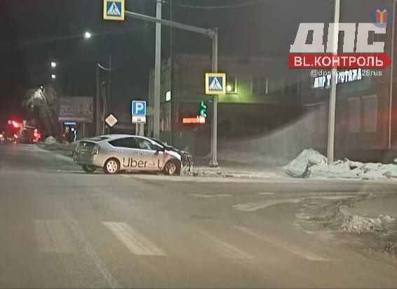 На перекрёстке в Благовещенске такси снесло ограждение (обновлено)