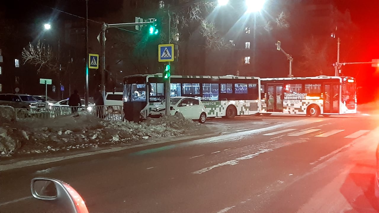 Вечером в субботу, 9 февраля, в Благовещенске на пересечении улиц Чайковского и Горького иномарка столкнулась с пассажирским автобусом. Кадры с места аварии в редакцию Амур.инфо прислали очевидцы. Фото: Госавтоинспекция Амурской...