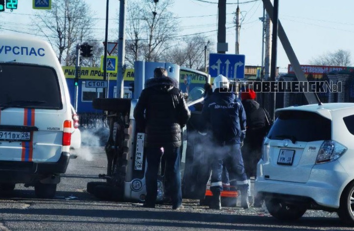 Daihatsu оказался на боку, пытаясь проехать перекрёсток в Благовещенске (новость обновлена)