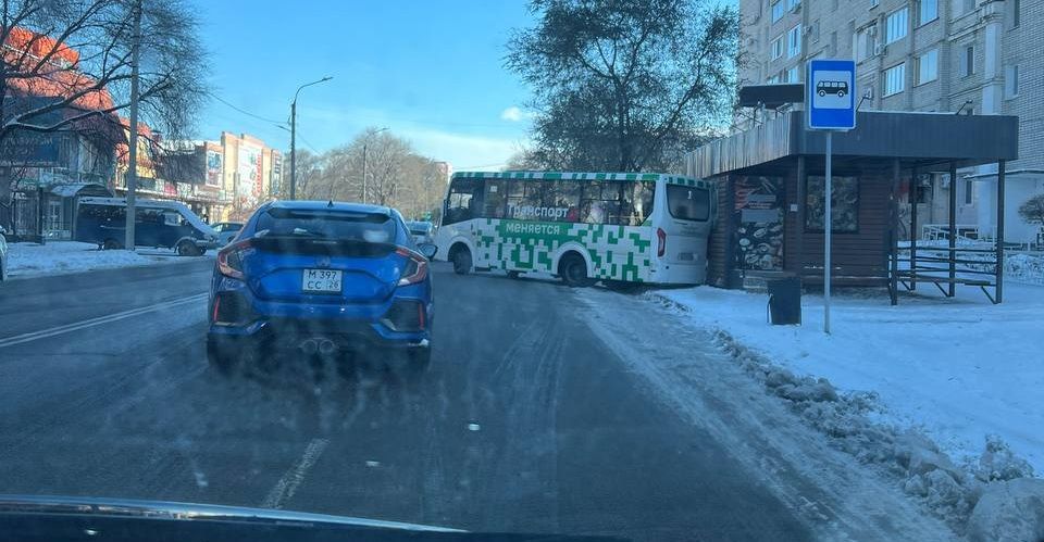 В Благовещенске автобус врезался в остановку