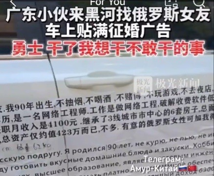 Парень из провинции Гуандун специально приехал в Хэйхэ, чтобы найти русскую жену. Для этого он даже разместил объявление на своем авто, рассказали в телеграм-канале «Амур-Китай». В объявлении молодой человек подробно...
