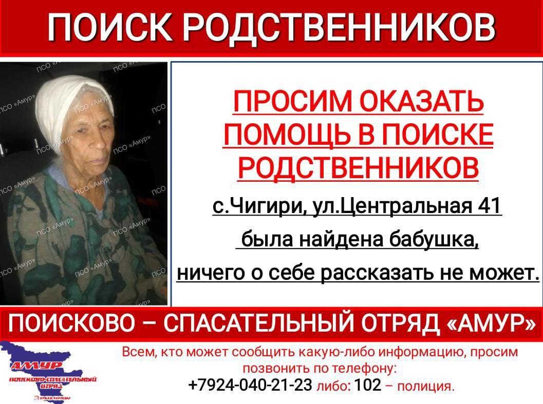 Волонтеры ПСО «Амур» просят неравнодушных амурчан помочь в поиске родственников потерявшейся женщины. Её нашли в районе улицы Центральной, 41 села Чигири. По словам поисковиков, бабушка не смогла ничего о себе...