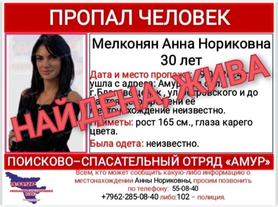 Как ранее сообщало Амур.инфо, 9 апреля без вести пропала Анна Мелконян. Сегодня, 12 апреля стала известна её судьба. Как рассказали в ПСО «Амур», женщина сама вышла на связь с поисковиками....