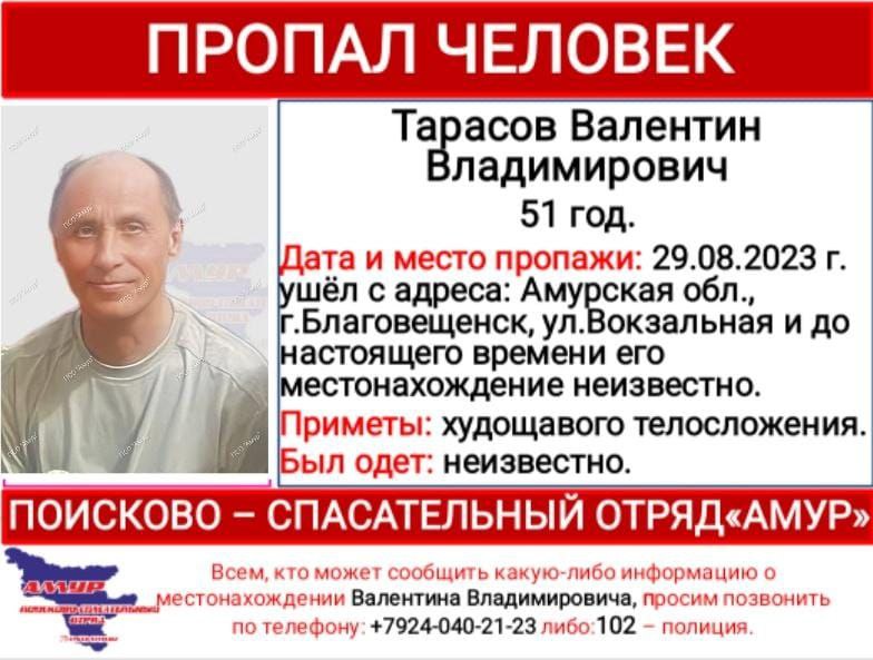 В областном центре продолжаются поиски пропавшего мужчины. 51-летний Валентин Тарасов ушёл из дома на улице Вокзальной ещё 29 августа. С тех пор его судьба неизвестна. Как сообщают поисковики ПСО «Амур»,...