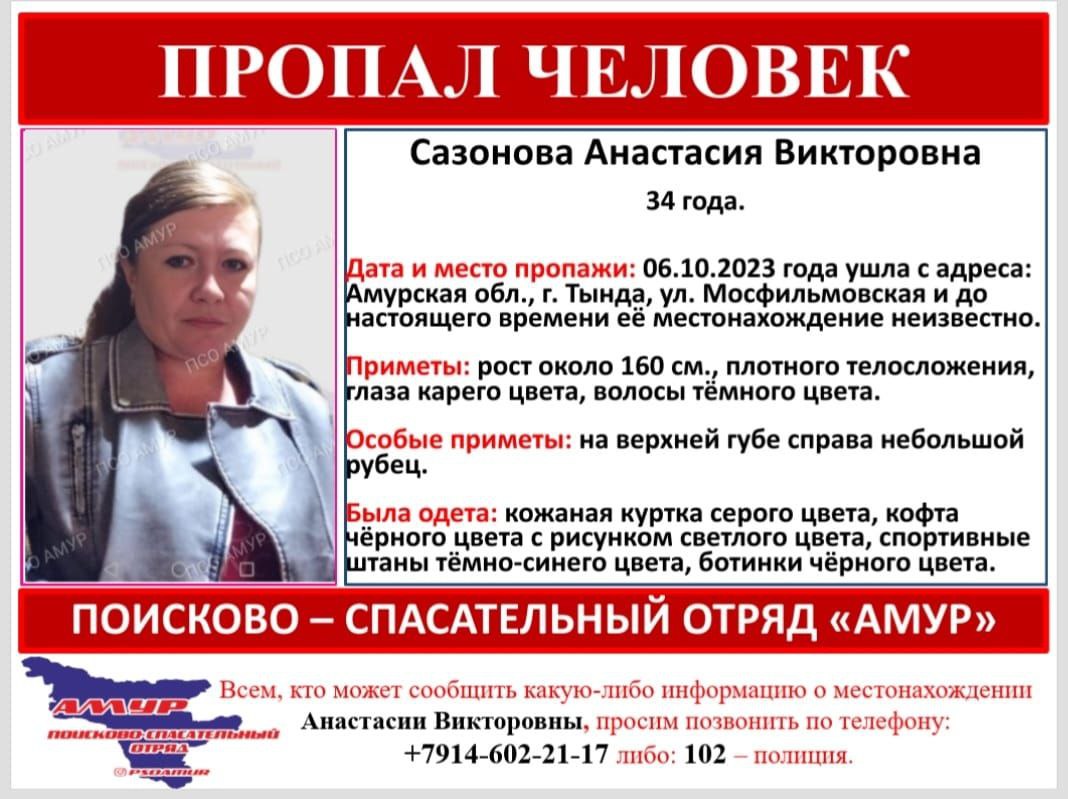 В Тынде 6 октября этого года из дома на улице Мосфильмовской ушла 34-летняя Анастасия Викторовна Сазонова. Её местонахождение до сих пор неизвестно, сообщает поисково-спасательный отряд «Амур». Рост пропавшей 160 сантиметров,...