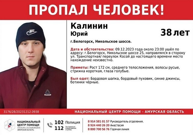 В Приамурье ведется розыск пропавшего мужчины, сообщает поисковая «Национальная служба помощи». Юрий Калинин пропал в Белогорске 9 декабря. Он вышел из дома на Никольском шоссе поздним вечером и направился к...