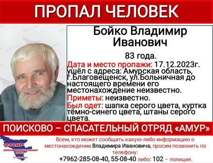 Волонтёры поисково-спасательного отряда «Амур» разыскивают в Благовещенске 83-летнего Владимира Ивановича Бойко. 17 декабря он ушёл из городской больницы, с тех пор о нём ничего не известно, сообщает телеграм-канал поисково-спасательного отряда...
