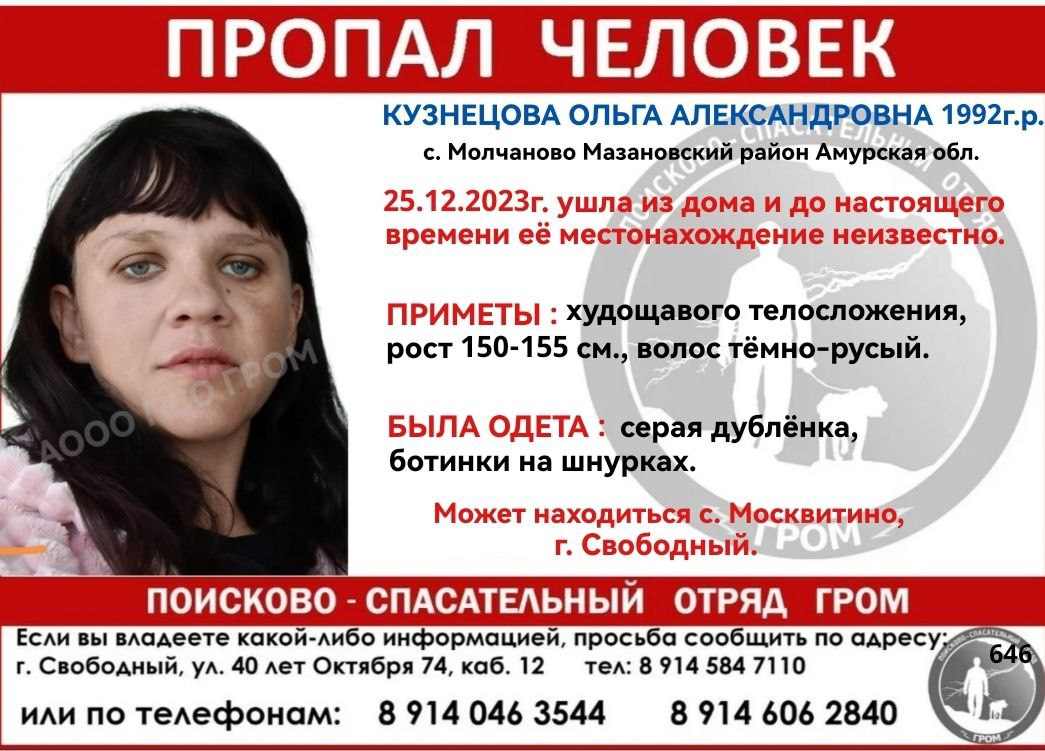 Волонтёры поисково-спасательного отряда «Гром» ведут поиск пропавшей Ольги Кузнецовой 1992 года рождения, пропавшей 25 декабря, сообщает штаб поисковиков. Ольга Александровна Кузнецова ушла из дома в селе Молчаново Мазановского района. Её...