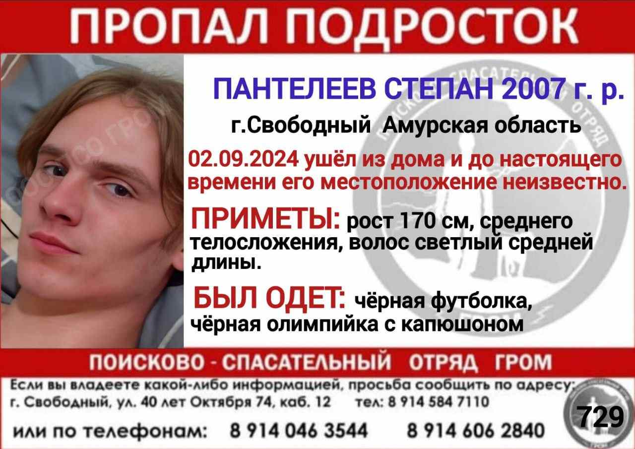 В Свободном 2 сентября ушёл из дома и не вернулся подросток. До настоящего времени его местонахождение неизвестно. Ориентировку о поиске разместил поисково-спасательный отряд «Гром». Степан Пантелеев высокий, в ориентировке указан...