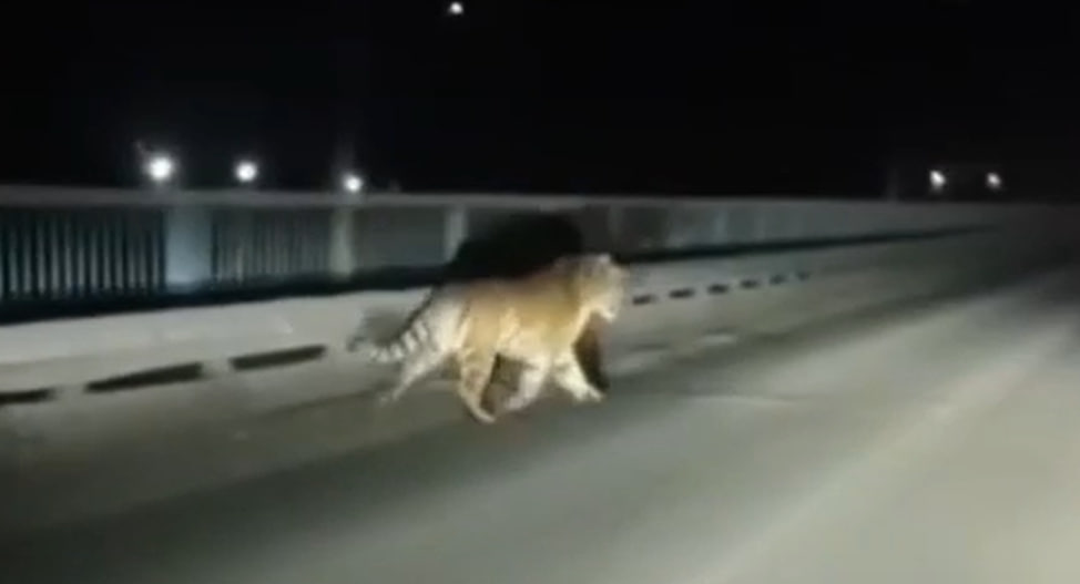 Приморцы засняли амурского тигра во время вечерней пробежки по мосту