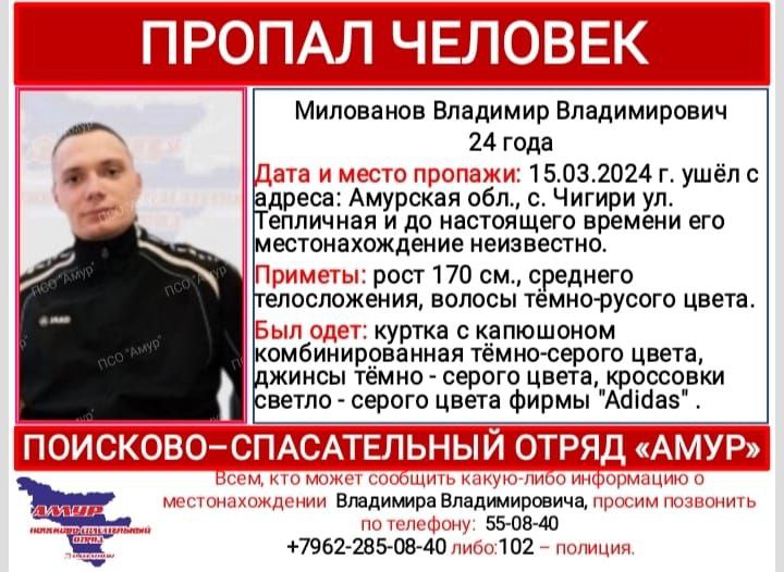 В Чигирях пропал 24-летний Владимир Владимирович Милованов. Молодой человек 15 марта ушёл с адреса на улице Тепличной, и больше его никто не видел. О поисках амурчанина сообщил поисково-спасательный отряд «Амур»....