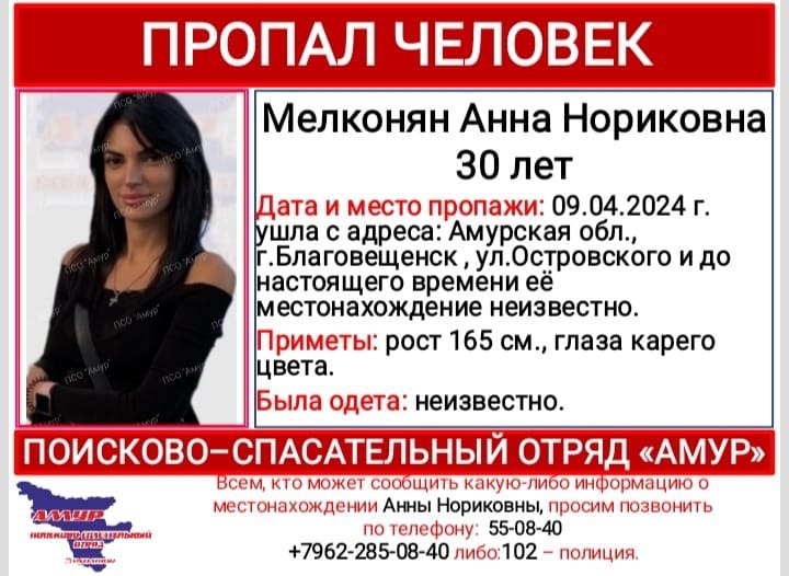 В областной столице пропала 30-летняя Анна Мелконян. Об этом сообщили в поисково-спасательном отряде «Амур». Во вторник, 9 апреля, она ушла с улицы Островского, до сих пор ее местонахождение не установлено....
