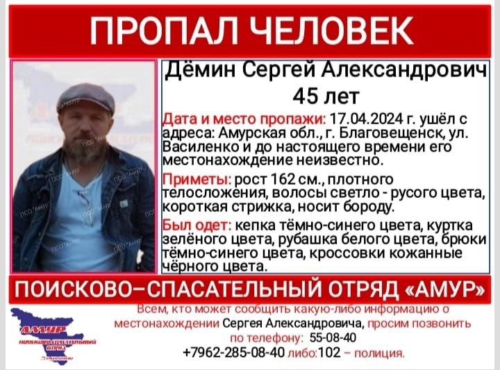 В Благовещенске пропал 45-летний Сергей Александрович Дёмин. Мужчина ушёл из дома на улице Василенко 17 апреля. Где он находится сейчас – неизвестно. Об этом рассказал поисково-спасательный отряд «Амур». Сергей плотного...