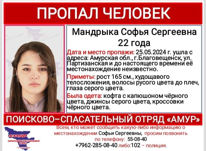 В Благовещенске пропала 22-летняя Софья Мандрыка. Об этом сообщили в поисково-спасательном отряде «Амур». Как рассказали поисковики, в субботу, 25 мая, девушка ушла с улицы Партизанской. До сих пор ее местонахождение...