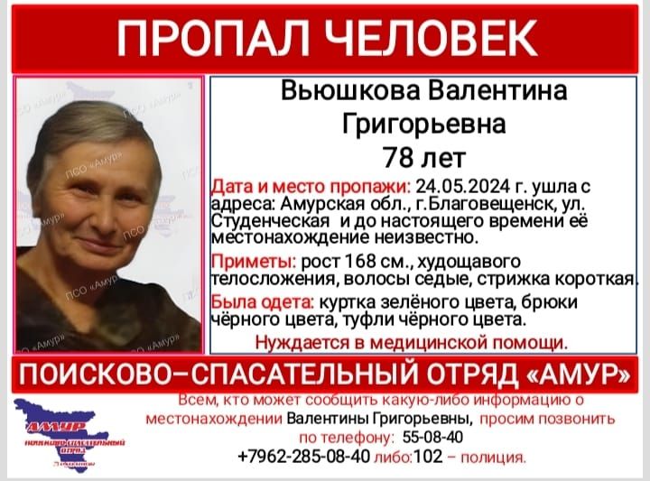 В Благовещенске пропала 78-летняя Валентина Григорьевна Вьюшкова. О её поисках сообщил поисково-спасательный отряд «Амур». Женщина нуждается в медицинской помощи, предупредили поисковики. 24 мая Валентина Григорьевна ушла с адреса на улице...