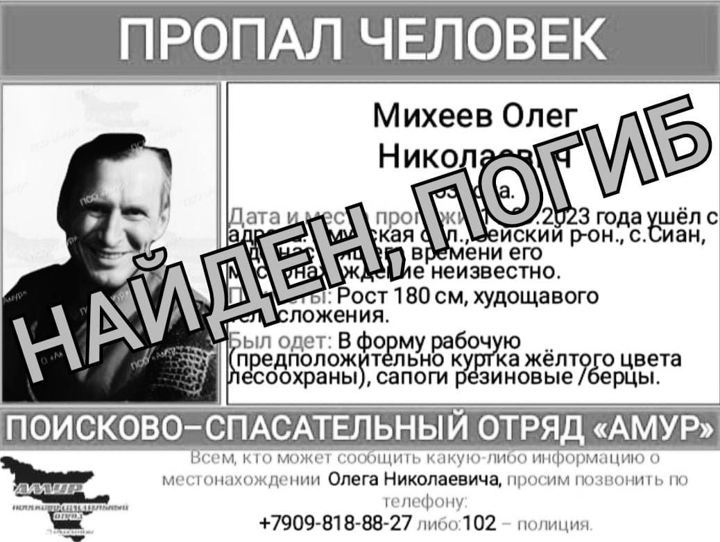 Волонтеры поисково-спасательного отряда «Амур» сообщили, что пропавшего 11 сентября жителя села Сиян Зейского района Олега Михеева нашли мертвым – эту информацию им предоставили родственники. Ранее поисковики отмечали, что он, как...