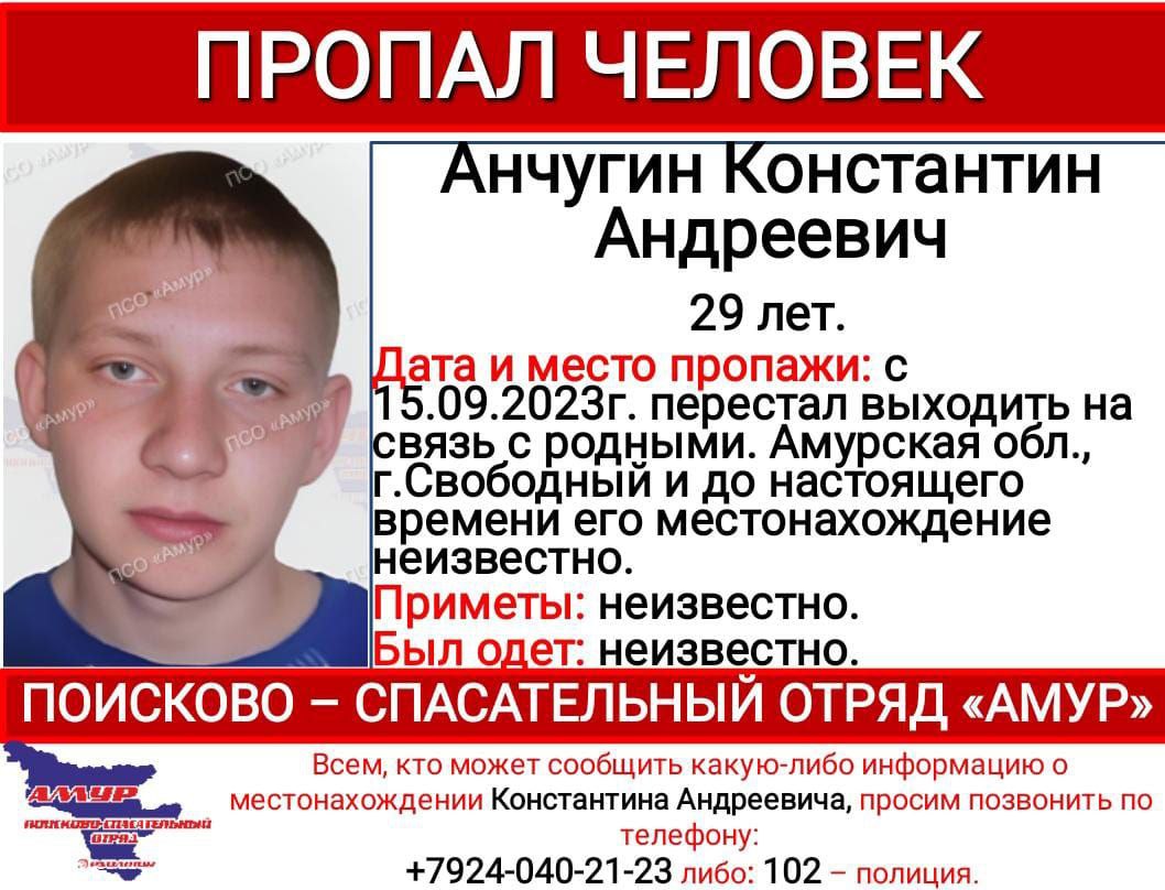 В Свободном разыскивают 29-летнего Константина Андреевича Анчугина. О поисках сообщил поисково-спасательный отряд «Амур». Константин не выходит на связь с родными с 15 сентября. Во что был одет мужчина в день...