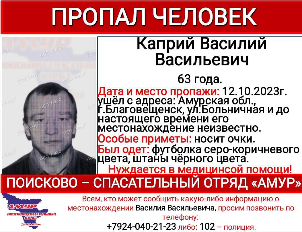В Благовещенске разыскивают 63-летнего Василия Васильевича Каприя. Мужчина пропал сегодня, 12 октября. Ориентировку опубликовал поисково-спасательный отряд «Амур». Пенсионер ушёл с адреса на улице Больничной. Где он находится сейчас – неизвестно....